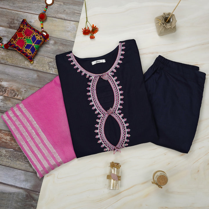 ๐ Trousers: Matching navy blue cambric fabric for a seamless ensemble